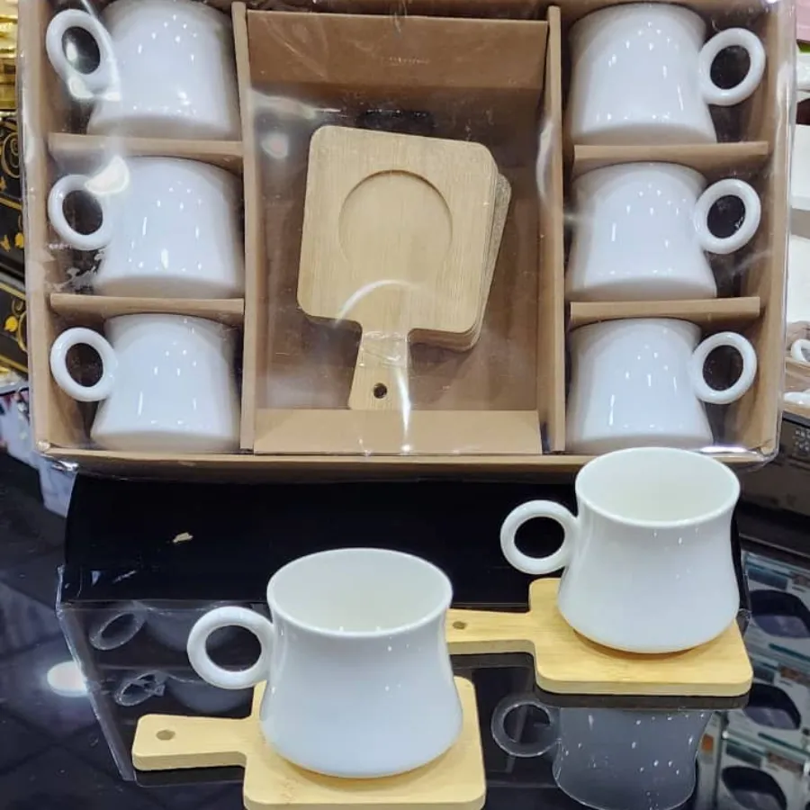 طقم فاخر من أكواب السيراميك المصممة بيد سيسر خشبي مميز، تأتي مع حمالة خشبية راقية تتيح لك عرض الأكواب بطريقة أنيقة ومرتبة. مثالي لمحبي التفاصيل الجميلة والأجواء الدافئة في تقديم القهوة أو الشاي.