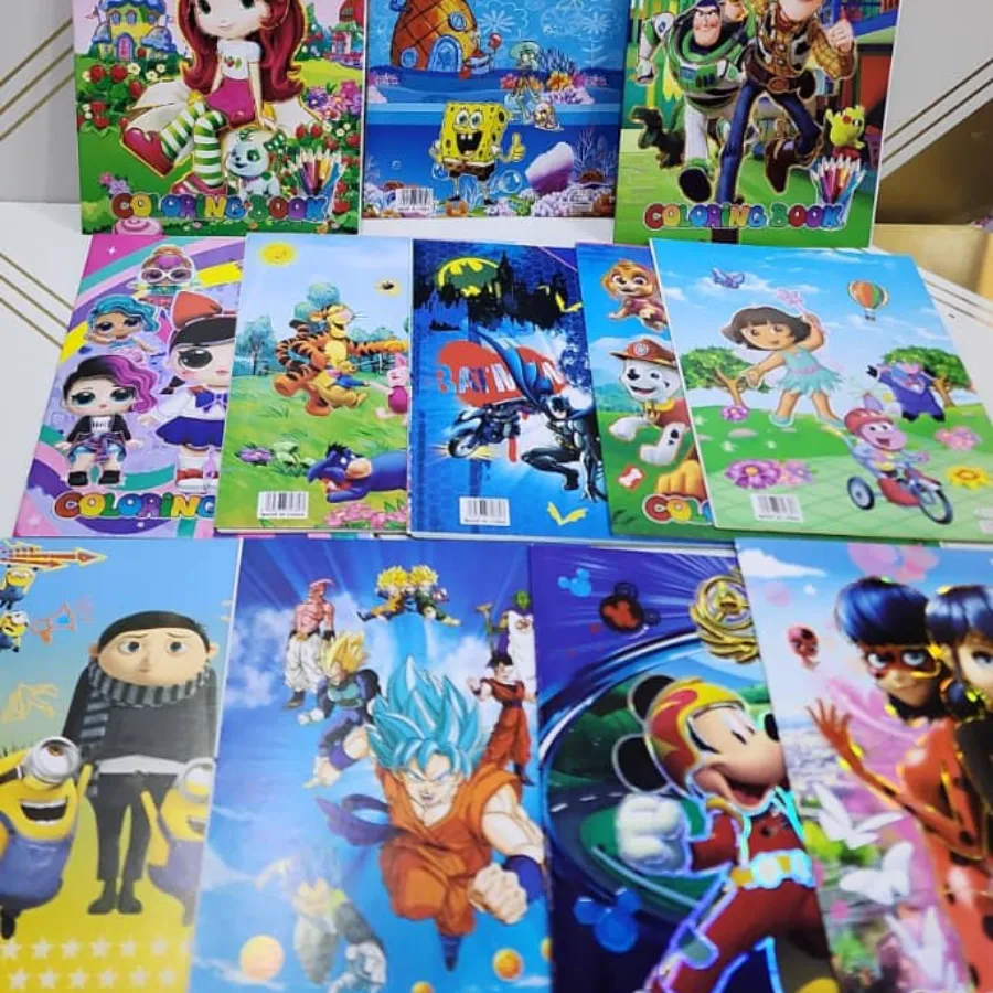 مجموعة مكونة من 12 دفتر تلوين برسومات مناسبة للأطفال، مرفقة بطوابع لطيفة تشجع على التعلم والمرح. الدفاتر تحتوي على رسومات تعليمية وترفيهية، وتساعد في تحسين مهارات التلوين والتركيز.