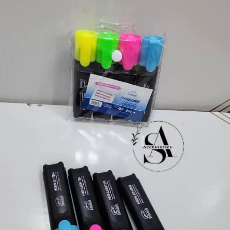 مجموعة أقلام توضيح عالية الجودة بألوان مبهجة وواضحة (أصفر، أخضر، وردي، أزرق). تصميم مريح للاستخدام اليومي في الدراسة أو العمل، مناسب للكتب والمذكرات دون أن يلطخ أو يتسرب للحبر.